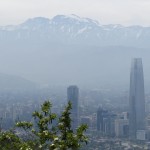 Diesiger Blick auf Santiago mit dem höchsten Turm Südamerikas und den Bergen im Hintergrund
